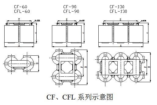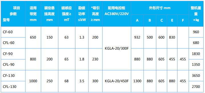 四、CF、CFL系列懸掛式電磁除鐵器主要技術參數(shù)、外形尺寸