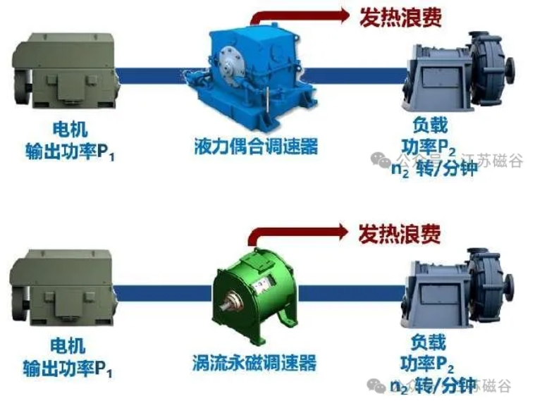 新余鋼鐵2000kW風機緩沖使用渦流永磁聯軸器,轉差超5%,按實際使用功率90%計,轉差損耗功率= 2000*90%*5%=90kW;按年工作8000小時,電費0.6元/度計算,年耗電費=90*8000*0.6=432000(元) 例2: